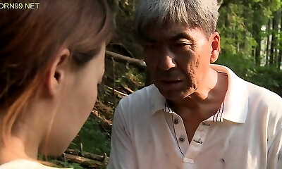 Spouse Helps Asian Wife With Grandpa Lover Outdoors